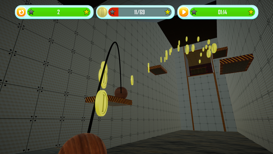 Ball Goes Roll is a third person, physics-based platformer where the player controls a rolling ball and must traverse a series of obstacles to reach the end of the level. The player is scored in three areas, the time taken to complete the level, the number of coins they collect and the number of resets (deaths) the player has.